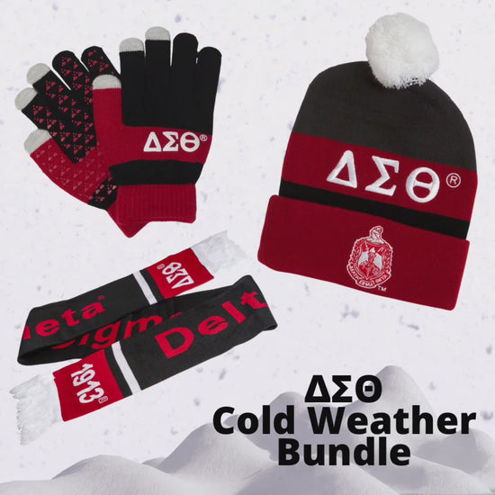 Stay warm in style with our Delta Sigma Theta Cold Weather Accessories Bundle! This set includes a cozy knit beanie with a pom featuring the DST logo, matching texting gloves, and a soft scarf. Perfect for any sorority sister or as a thoughtful gift. Shop now and showcase your DST pride this winter! In Red/White or Red/Black
