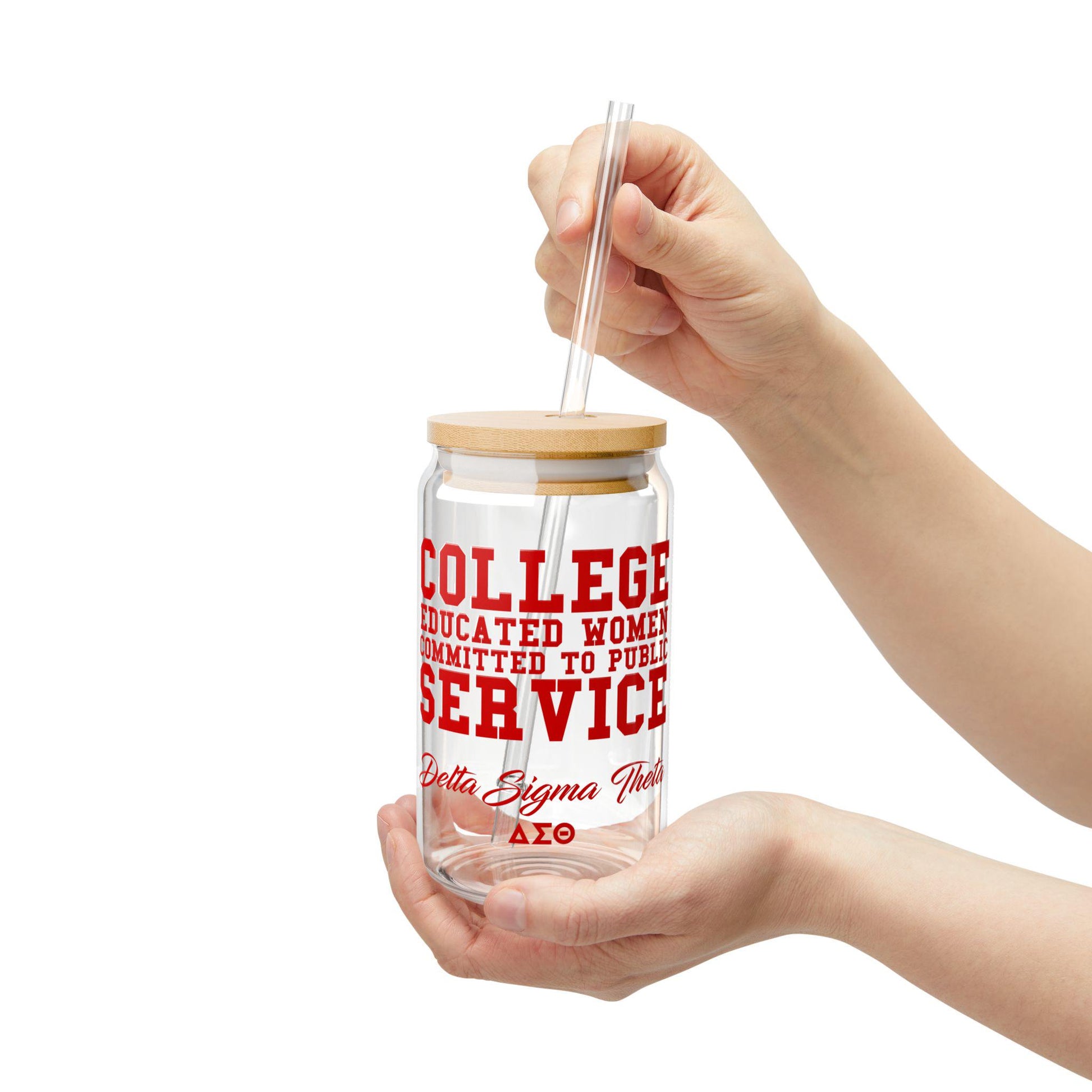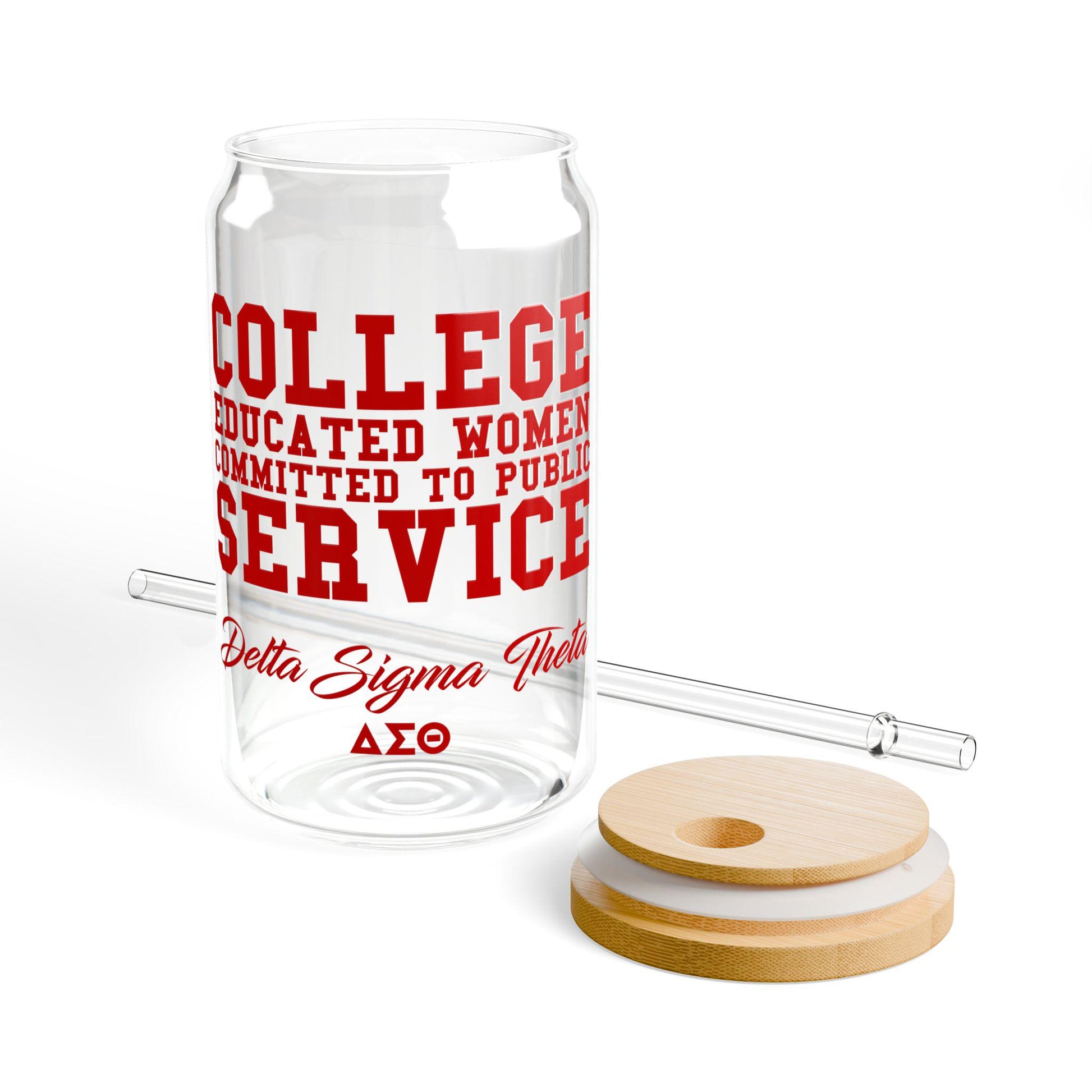 Expertly crafted from clear, durable glass, this Delta Sigma Theta glass cup prominently features the revered Mission Statement, allowing you to carry the essence of our beloved Sorority with you. Its "sipper" design makes it perfect for your iced coffee, tea, smoothies, or water, whether you're at home, the office, or on the go.